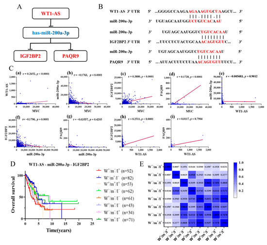 Correlation analysis and validation of WT1-AS, miR200a, and IGF2BP2 expression. (A) A schematic model of ceRNA. Blue indicates downregulation and red indicates upregulation. (B) Base pairing between miR-200a-3p and the target site in the WT1-AS, IGF2BP2, and PAQR9 predicted by Tarbase and TargetScan, respectively. (C) Correlation analysis between WT1-AS, miR200a, IGF2BP2, and PAQR9 in LUAD. (D,E) Correlation analysis of different expression patterns of WT1-AS–miR-200a-3p–IGF2BP2 with OS of LUAD patients and with a heat map of the significance of differences.