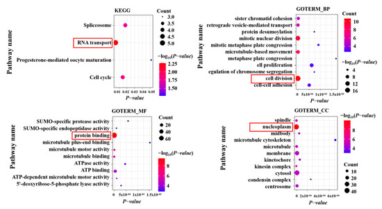 In order to further explore the possible function of IGF2BP2 in LUAD, Gene Ontology (GO) and Kyoto Encyclopedia of Genes and Genomes (KEGG) enrichment analysis were performed on the top 100 IGF2BP2-related genes in LUAD (Figure 5). The enrichment term associated with IGF2BP2 was “RNA transport”. In addition, GO enrichment analysis associated with IGF2BP2 was mainly enriched in “cell division”, “protein binding”, and “nucleoplasm”.