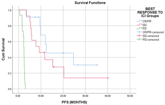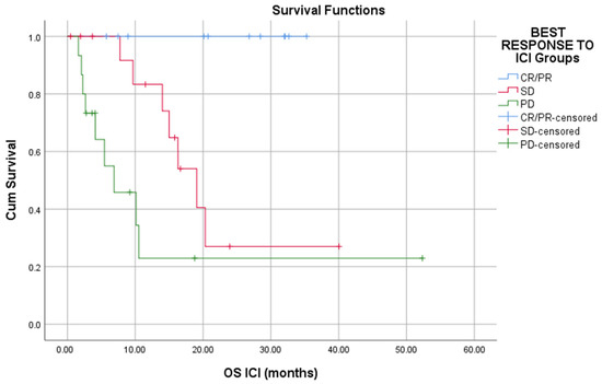 Responders to ICI had a statistically significant prolonged OS and PFS than patients who had SD or PD (Long rank, p < 0.01) (Figure 1 and Figure 2).