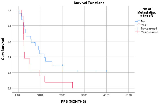 Presence of more than three metastatic sites is associated with worse PFS (p = 0.023).