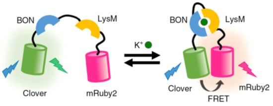 Schematic of the KIRIN1-GR FRET system where emission at a higher wavelength is detected after potassium binding. Image adapted with permission []. Copyright 2019 Springer Nature.