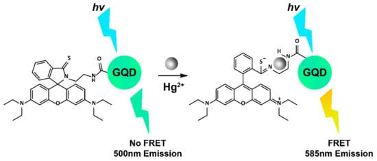 Proposed FRET mechanism of rhodamine-GQDs detecting Hg2+. Image adapted with permission []. Copyright 2015 Elsevier.