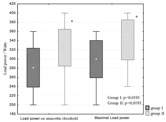 The groups of the examined athletes did not have significant differences in age, weight or height (Table 1). At the same time, load power on the anaerobic threshold and maximal load power increased significantly (p < 0.05) with an increase in sports activity (Figure 1).