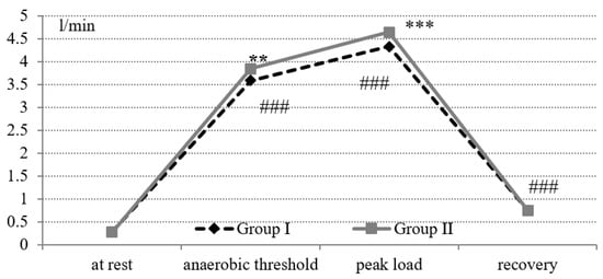 When performing the test “until exhaustion”, all cross-country skiers showed a statistically significant increase in oxygen uptake during the passage of the anaerobic threshold (p = 0.001) compared with indicators at rest (Figure 2). At the level of the AT and peak load, group II was characterized by higher values of oxygen uptake (p < 0.01 and p < 0.001, respectively). During the recovery period, oxygen uptake values decreased significantly in both groups (p < 0.001). During rest and during the recovery period, the oxygen uptake did not differ significantly in the study groups.