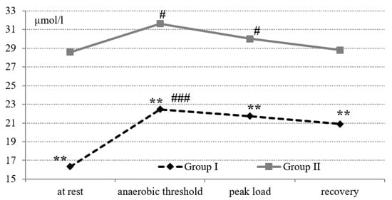 At rest and during the test “until exhaustion”, the values of NOx in Group II were significantly higher than the values of NOx in Group I (p < 0.01) (Figure 3). For athletes, Group I and Group II showed an increase in NOx at the AT compared with the rest (p < 0.001 and p < 0.05, respectively) and a decrease for athletes in group II at peak load (p < 0.05). During the recovery period, the NOx level in the examined groups did not change compared to the peak load.
