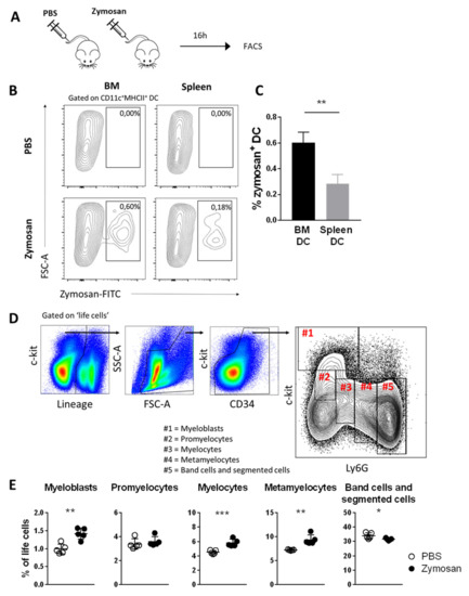 3.6. Zymosan Is Taken Up by BM DCs after In Vivo Administration and Boosts the Number of Neutrophil Progenitors in BM