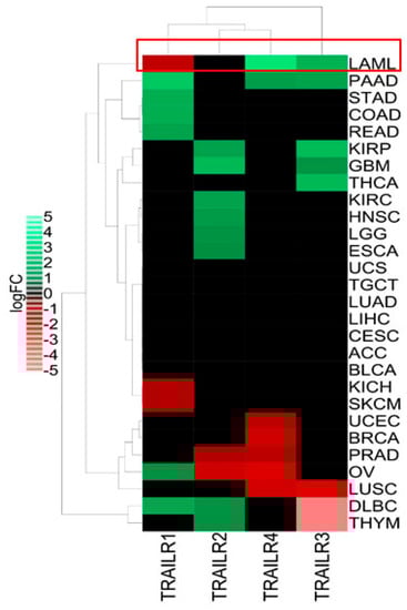 TRAIL receptors expression pattern across 28 TCGA cancer types. The RNA sequencing data for 28 TCGA (The Cancer Genome Atlas) cancers as well as normal adjacent tumors and normal GTEx (Genotype-Tissue Expression) samples were extracted from Gene Expression Profiling Interactive Analysis 2 (GEPIA2). Then, the differential mRNA expression levels (log2 fold change (FC)) of four well-known TRAIL-R1 (DR4), TRAIL-R2 (DR5), TRAIL-R3 (DcR1) and TRAIL-R4 (DcR2) were analyzed in each cancer compared to their corresponding normal samples. The heatmap construction and clustering were performed as mentioned in Materials and Methods. Green and red colors represent significant (p-value < 0.01) upregulation (log2FC > 1) or downregulation (log2FC < 1) of TRAIL-Rs in different cancers, respectively. TCGA cancer groups include BLCA (bladder urothelial carcinoma), BRCA (breast invasive carcinoma), CESC (cervical squamous cell carcinoma and endocervical adenocarcinoma), CHOL (cholangiocarcinoma), ESCA (esophageal carcinoma), GBM (glioblastoma multiforme), HNSC (head and neck squamous cell carcinoma), KIRC (kidney renal clear cell carcinoma), KICH (kidney chromophobe), KIRP (kidney renal papillary cell carcinoma), LAML (acute myeloid leukemia), LIHC (liver hepatocellular carcinoma), LUAD (lung adenocarcinoma), LUSC (lung squamous cell carcinoma), PAAD (pancreatic adenocarcinoma), PCPG (pheochromocytoma and paraganglioma), PRAD (prostate adenocarcinoma), SARC (sarcoma), SKCM (skin cutaneous melanoma), STAD (stomach adenocarcinoma), THCA (thyroid carcinoma), THYM (thymoma), UCEC (uterine corpus endometrial carcinoma). Leukemia (LAML) has been highlighted in a red rectangle.