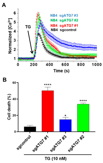 We next investigated whether ATG7 loss can influence cell death in the NB4 cells treated by TG. While TG was unable to stimulate apoptosis in control NB4 cells, a significant induction of cell death was observed in ATG7-KO cell lines (Figure 5B). Thus, an increase in ER Ca2+ content resulting from ATG7 loss is associated with enhanced cell death in response to TG. It is possible that the induction of a prolonged unresolved ER stress in ATG7-depleted cells is responsible for the activation of cell death by TG as reported in [62]. Additional mechanisms have been proposed for the induction of cell death by TG which rely on DR5 upregulation, the non-autophagic function of LC3B and the involvement of unfolded protein response (UPR) mediators [63].