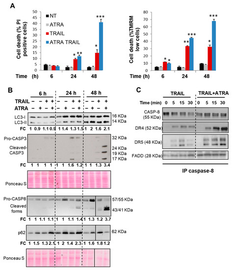 Effects of TRAIL, alone or in combination with ATRA on autophagy, DISC formation and cell death. NB4 cells were pretreated with 10 nM ATRA for 24 h alone or with TRAIL (250 ng/mL) for the indicated times (6–48 h). (A) Early apoptosis (MOMP) and late apoptosis (plasma membrane permeability) were then measured by staining the cells with TMRM and PI staining, respectively. The percentage of cells exhibiting low TMRM staining and high PI staining were scored for each condition. Results were from three independent experiments and expressed as means ± S.D. Statistically, changes in the treated groups (ATRA +/- TRAIL) compared with none-treated group (NT) have been represented as * p ≤ 0.01, ** p ≤ 0.001 and *** p ≤ 0.0001. (B) Immunoblot analyses of CASP-8 and CASP-3 processing and autophagy markers levels (LC3-II and p62) were shown. For the densitometry quantification, CASP-3 cleaved fragments, CASP-8 cleaved forms, p62 and LC3B-II/LC3B-I protein levels were normalized to corresponding Ponceau red S using the ImageJ software. The protein fold changes (FC) represent the ratio of treated cells versus control non-treated cells at each time point. (C) NB4 cells were pretreated with ATRA (10 nM) for 24 h and then treated with His-TRAIL (800 ng/mL) for the indicated time. After cell lysis, the DISCs were immunoprecipitated using an antibody against caspase 8 and analyzed by Western blotting for the expression levels of DISC components (CASP-8, DR4, DR5 and FADD).