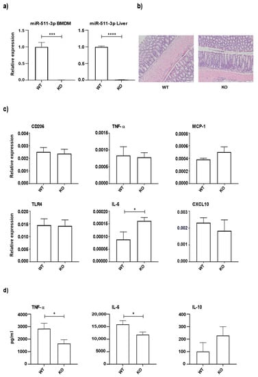Previously we suggested that miR-511-3p affects macrophage TLR4 responses and ameliorates intestinal inflammation []. We further investigated the exact effect of miR-511 deficiency on intestinal inflammation using miR-511-deficient mice. As expected miR-511-deficient mice lacked miR-511-3p in BMDMs and liver tissue (Figure 1a). Colons of miR-511-deficient mice showed no infiltration of granulocytes/monocytes, ulceration, fibrosis etc. as shown by histology (Figure 1b). No differences were observed in relative mRNA expression of CD206, TNF-α, MCP-1, TLR4, and CXCL10 in colons of WT and miR-511-deficient mice (Figure 1c). Interestingly, a slight but significant upregulation of IL-6 expression was seen in miR-511-deficient mice compared to WT (Figure 1c). Since we previously found that knockdown of miR-511-3p reduces macrophage lipopolysaccharide (LPS) responses we tested if macrophages from miR-511-deficient mice were also affected in their LPS responses. miR-511-3p is highly expressed in M2 derived macrophages [] therefore, BMDM from miR-511-deficient and WT mice were cultured and M2 differentiated macrophages were stimulated with LPS (Figure 1d). These macrophages showed a significant reduction in TNF-α and IL-6 response and no significant effect was seen on IL-10 response upon LPS stimulation compared to WT M2 macrophages (Figure 1d). In contrast, no significant effect was seen on TNF-α, IL-6 and IL10 mRNA levels of these macrophages (supplementary Figure S1a). Together, our data show that miR-511-deficient mice have healthy colons but macrophage function is affected.