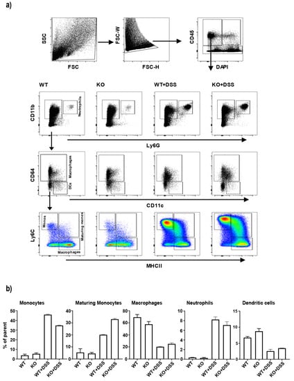 Immune cell composition in the colons of wild-type and miR-511-deficient mice. Immune cell populations of colons from WT and miR-511-deficient mice were analyzed using flow cytometry. The following gating strategy was used: (a) Debri was excluded using forward scatter (FSC) and side scatter (SSC) gating, followed by excluding doublets by FSC-H and FSC-W gating. Live leukocytes were selected as DAPI-CD45+. The resulting cells were then analyzed for CD11b, Ly6G, CD11c, CD64, Ly6C, and MHCII to identify neutrophil, DC, monocyte (monos), maturing monocyte (maturing monos) and macrophage populations. (b) Relative contribution of different immune cell populations in control (WT, KO) and DSS groups (WT+DSS, KO+DSS), respectively. Neutrophil (CD11b+Ly6G+), dendritic cell (CD11b+Ly6G-CD64-CD11c+), monocyte (CD11b+Ly6G-CD64+Ly6C+MHCIIa-), maturing monocyte (CD11b+Ly6G-CD64+Ly6C+MHCIIa+), macrophage (CD11b+Ly6G-CD64+Ly6C-MHCIIa+) contributions are indicated as percentage of parent gate. These data represents pooled data of two independent experiments with 5 mice per group per experiment. Error bars indicate standard error of the mean.