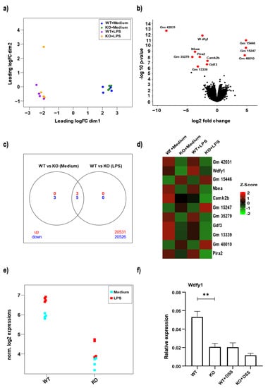 Differential gene expression analysis of miR-511-deficient and wild-type macrophages. Bone marrow-derived M2 macrophages were generated from WT and miR-511-deficient mice. WT and miR-511-deficient groups (KO) with and without LPS stimulation were compared. (a) Multidimensional scaling plot (MDS) using the top 500 most variable genes between samples to calculate the pairwise distances approximating the typical log2 fold changes between samples. The 16 samples are designated as WT+medium (blue), KO+medium (green), WT+LPS (purple), and KO+LPS (orange). (b) Volcano plot comparing WT with miR-511-deficient conditions. Differentially transcribed genes with a −log10 (p-value) > 6 are indicated with a red dot and annotated by their gene symbol. (c) Venn diagram of significant differentially expressed genes, upregulated genes (red) and downregulated genes (blue). A p-value <0.05 corrected for multiple testing using the Benjamini-Hochberg false discovery rate is used as a cut-off (d) Heatmap of top 11 differentially expressed genes. The mean of the gene expression per condition was used and the values were standardized. (e) Wdfy1 transcription levels in WT and miR-511-deficient macrophages with LPS (designated in red) and without LPS stimulation (designated in blue). (f) Wdfy1 gene expression in colon homogenates of control (WT, KO) and DSS groups (WT+DSS, KO+DSS), respectively by qPCR. N = WT = 4, KO = 5, WT+DSS = 9, KO+DSS = 10. The mRNA levels were normalized for their reference genes. Individual values are expressed as mean and standard error of mean. Statistical differences were tested by independent t-test, where a p-value of <0.05 was considered to be significant. ** p-value < 0.01.