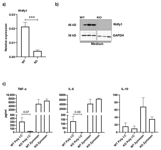 This study is the first to identify Wdfy1 as a potential target for miR-511. Using RNA-seq to identify potential targets on bone marrow-derived M2 macrophages, we found Wdfy1 to be one of the few differentially expressed genes between WT and miR-511-deficient macrophages (Figure 4). WDFY1 is a crucial adapter protein involved with positively regulating TLR 3 and 4 signaling pathways, by recruiting TIR-domain-containing adapter-inducing interferon-β (TRIF) []. Furthermore, WDFY1 was also shown to play a role in autophagy [,] and Wdfy1 expression is also related to mitochondrial dysfunction in Alzheimer’s disease of a mouse model []. For instance, an increase in WDFY1 levels followed by vascular endothelial growth factor-nontyrosine kinase receptor (VEGFC-NRP2) axis depletion induces cell death []. Although the function of WDFY1 still remains obscure, one study reported the role of Wdfy1 in innate immunity by comparing the immune response of WT and Wdfy1-deficient mice against TLR3 (Poly I:C) and TLR4 (LPS) agonists []. Wdfy1-deficient mice showed impaired inflammatory cytokines in BMDMs [], which shows that mouse Wdfy1 is important for TLR3 and TLR4 signaling. In line with this, we first showed that the Wdfy1 gene was significantly downregulated in both colons of miR-511-deficient mice (Figure 4f) and macrophages cultured from these mice (Figure 5a). Interestingly, Wdfy1 was not detected at protein level in these macrophages (Figure 5b). Also, the mRNA expression of the gene in macrophages was low (Figure 5a) so it might indicate that miR-511 is protecting it against degradation and thus affecting stability of mRNA, post-translationally []. Besides reduced inflammatory responses upon TLR4 stimulation, miR-511-deficient macrophages also showed reduced TNF-α and IL-6 responses when stimulated with TLR3 agonist (Poly I:C) (Figure 5c). Upon Zymosan challenge, miR-511-deficient macrophages did not respond differently from WT macrophages, which suggests that signaling pathways downstream of Wdfy1 is affected while other pattern recognition remain intact (Figure 5c). Together this suggests that miR-511 deficiency causes a downregulation of Wdfy1 which affects TLR3 and TLR4 responses. However, to confirm a direct interaction between miR-511 and Wdfy1, experiments such as reporter gene assays or pull-down assays are needed.