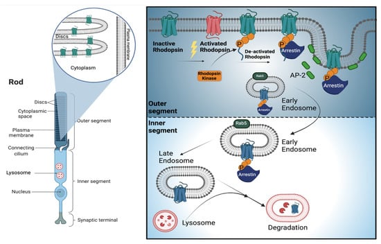 Distal-to-proximal trafficking of rhodopsin in photoreceptors. (Left) Schematic representation of primary structural/functional region of rod photoreceptor with a magnification of outer segment discs. (Right) After light-induced activation, rhodopsin receptor is de-activated by rhodopsin kinase-dependent phosphorylation and binding with arrestin. The subsequent interaction with AP-2 protein allows the formation of the early endosome which travels from the outer to inner segment to enter the endolysosomal system. Late endosome–lysosome fusion ultimately led to rhodopsin degradation.