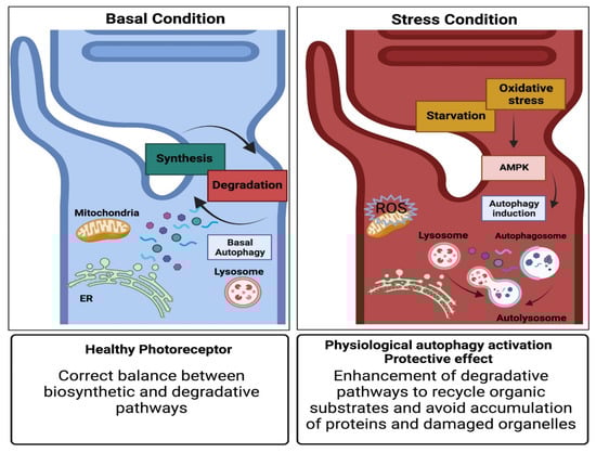 AMPK-dependent stress response in photoreceptors. (Left) In basal condition, the healthy state of photoreceptors is ensured by the correct balance between biosynthetic and degradative pathways. (Right) In case of stress conditions (starvation or oxidative stress), the AMPK pathway is activated allowing autophagosome formation and autophagy induction as protective, compensatory mechanisms to recycle organic substrates and avoid stress-dependent cell damage.
