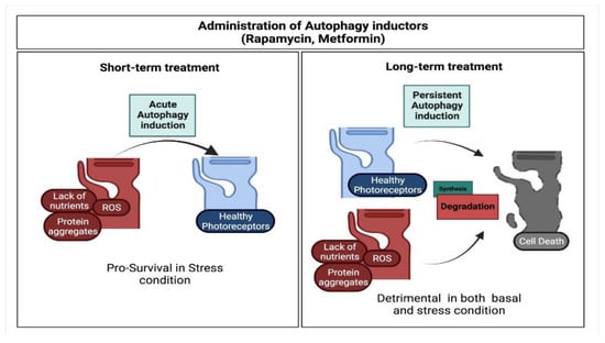 Impact of autophagy activation on photoreceptors’ health. Schematic representation of short- and long-term effects of autophagy activator treatment on photoreceptors’ health.
