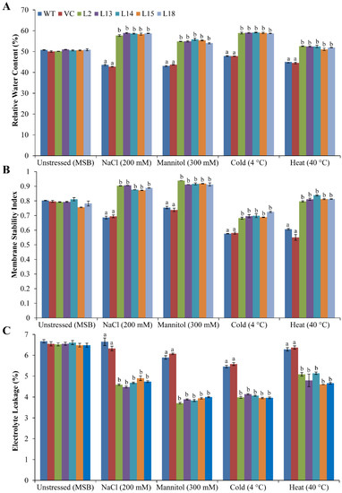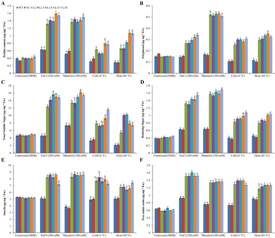 3.6. Osmoprotectants Accumulate in Plants Overexpressing the SbERD4 Gene under Stress Conditions