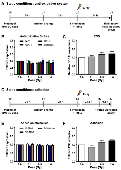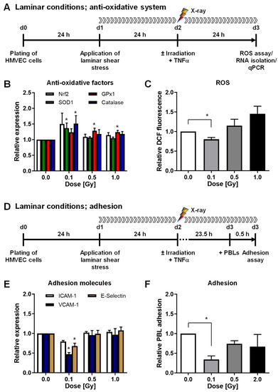First, we aimed to examine the impact of low doses of X-rays (0.1 and 0.5 Gy) on the mRNA expression of the transcription factor Nrf2 and the anti-oxidative enzymes SOD1, GPx1, and Catalase 24 h after pro-inflammatory stimulation with TNF-α under more physiological laminar flow shear stress conditions. High doses of 1 or 2 Gy were used as a reference. In addition, mRNA expression of adhesion molecules ICAM-1, VCAM-1, and E-selectin and relative adhesion of PBL to HMVEC were analyzed. The time courses of the experiments are depicted in Figure 1A,D.