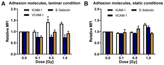 To verify our findings on mRNA expression level, we measured the cell surface protein expression of cell adhesion molecules. Irradiation under laminar conditions resulted in a slightly reduced surface expression of VCAM-1 and E-Selectin after 0.1 Gy irradiation (Figure 3A). In concordance with the above-described findings on mRNA level, irradiation under static conditions did not modulate adhesion molecule protein expression (Figure 3B), confirming our previous findings [23].