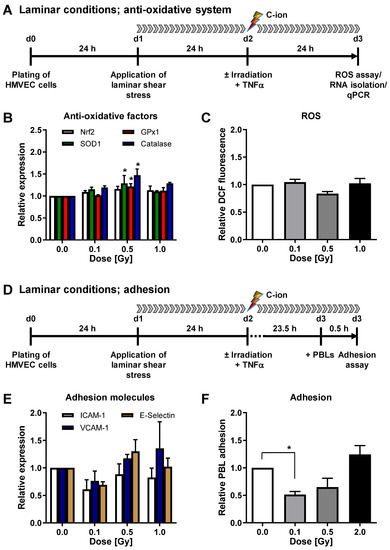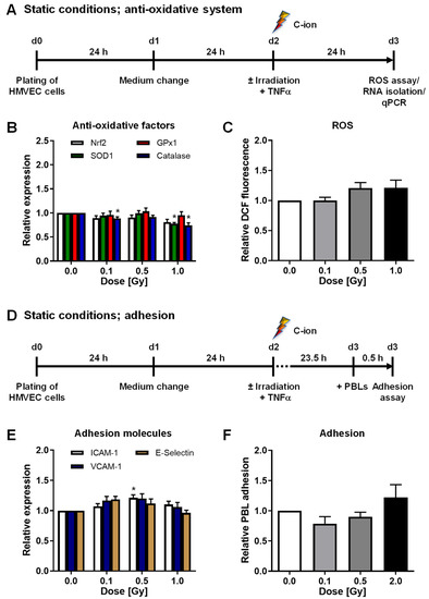 By contrast, C-ion exposure of HMVEC cells cultured under conventional static conditions (experimental setup depicted in Figure 5A,D) slightly modulated the mRNA expression of anti-oxidative factors (Figure 5B) and adhesion molecules (Figure 5E), while intracellular ROS content (Figure 5C and Figure S4C) or PBL adhesion (Figure 5F and Figure S4D) were not affected at 24 h after irradiation.