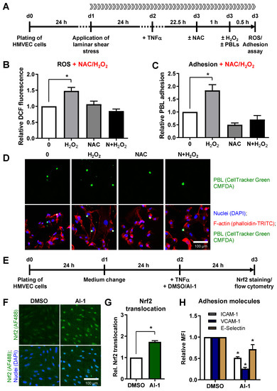 Notably, treatment of HMVEC with H2O2 and NAC under static cell culture conditions yielded similar results as under physiological flow (Figure S7A), showing an induction of ROS (48%) and PBL adhesion (74%). These effects were abrogated when NAC pretreatment was applied (Figure S7B–D).