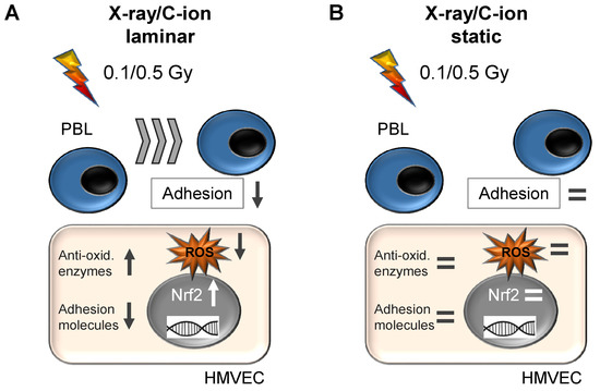 In summary, our experimental data support the preclinical hypothesis that irradiation with single doses between 0.1 and 0.5 Gy of both X-rays and C-ions seems to be most effective for inducing anti-inflammatory responses in endothelial cells. In line with that, here, we propose a relationship of irradiation of endothelial cells, oxidative stress defense, and PBL adhesion. Under physiological laminar shear stress, the irradiation of HMVEC induces the mRNA expression of Nrf2 and anti-oxidative enzymes, resulting in a decreased metabolic ROS content, contributing to the reduced expression of adhesion molecules and decreased PBL adhesion and to anti-inflammatory effects of low-dose irradiation (Figure 7A). On the other hand, the irradiation of HMVEC, while cultivated under non-physiological static cell culture conditions, does not yield an anti-inflammatory response of immune cells (Figure 7B). Different LET have an impact on the local minimum in the non-linear dose–response relationship, which is for ROS at 0.1 Gy for X-rays and at 0.5 Gy for higher LET C-ions, contributing to a decreased PBL adhesion at 0.1 and 0.5 Gy. In conclusion, we suggest similar mechanisms underlying the anti-inflammatory effects of photon or Radon LD-RT, both involving the anti-oxidative system of endothelial cells.