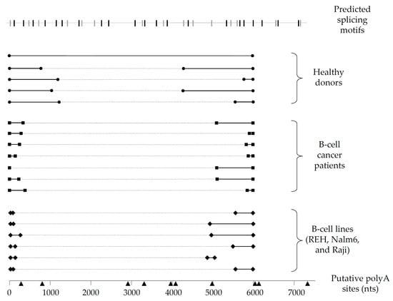 Schematic representation of Pax-5 3′UTR editing in B-lymphocytes. Pax-5 3′UTR profiling of splicing patterns was performed in B-lymphocytes from healthy donors (filled circles), B-cell cancer patients (filled squares), and B-cell cancer lines (filled diamonds). The bold black lines represent the complementary alignment with the referenced full-length Pax-5 3′UTR sequence (NCBI/NM_016734.3) [48], whereas the dotted gray lines represent the excised sequences from the spliced region. Putative polyA signals (black triangles) located at their respective nucleotide position (bottom line) were predicted for polyA canonical and non-canonical motifs using bioinformatics software tools (i.e., Softberry POLYAH, DNA polyA signal miner, and PolyA pred).