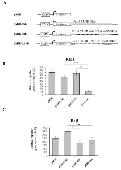 Reporter constructs were then transiently transfected into B-cell cancer cell lines (Raji and REH) where luciferase signals were normalized on transfection efficiency. In REH cells, we observed that reporter constructs bearing shorter 3′UTRs (i.e., pMiR-1kb and pMiR-0.3kb) exhibited significantly greater relative luciferase activity (83 and 79%, respectively) in comparison to plasmids with longer 3′UTR regions (pMiR-6kb) (Figure 4B). Similarly, transfections of Raji B-cells with reporter genes characterized by shorter 3′UTRs (i.e., pMiR-0.3kb) exhibited greater luciferase activity compared to plasmids with longer 3′UTRs (i.e., pMiR-6kb and pMiR-1kb) (Figure 4C). Interestingly, we also observed slight differences between the REH (immature) and the Raji (mature) B-cell models in terms of relative reporter activity associated with the pMiR-1kb construct. We believe that these variations may be due to cell type, lineage maturity, post-transcriptional regulating elements, and differential miRNA profiles from each cell type. Globally, our results demonstrated that mRNA translation frequency is significantly regulated by the Pax-5 3′UTR length and structure (sequence). These observations further strengthened the role and impact of 3′UTR editing in aberrant and oncogenic Pax-5 expression associated with B-cell cancers.