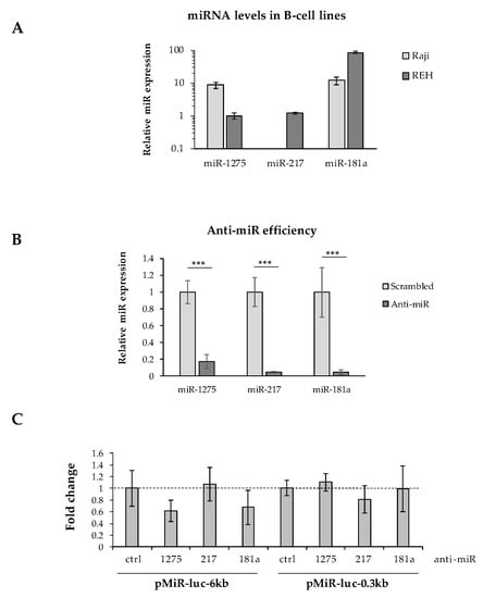 It has been well described that mRNA 3′UTR editing is a prominent process for oncogenes to avoid miRNA regulation [26,27]. To assess the impact of Pax-5 3′UTR shortening on its susceptibility to (or evasion of) miRNA regulation, we studied the activity of miRNA targeting on the internal excised regions found on shorter 3′UTRs from the Pax-5 transcript. Predicted miRNAs targeting the spliced 3′UTR region (nucleotides +52 to +5619) were established by web-based tools and cross-referenced with miRNAs from the literature for B-cell expression levels and role in B-cell biology or oncogenesis (Supplementary Table S3). Three miRNAs were thus selected (i.e., miR-1275, 217-5p, and 181a-5p) and validated for their expression in our B-cell models using RT-qPCR (Figure 5A). Given that only REH cells concomitantly expressed all three selected miRNAs, these cells were co-transfected with a pMiR-Report construct (pMiR-6kb or pMiR-0.3kb) and an anti-miRNA (inhibiting each selected miRNA).