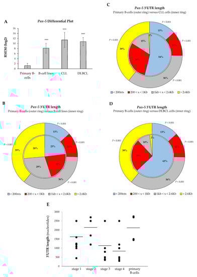 3′UTR shortening profiles in B-cell cancer lesions. Comparison analyses of (A) Pax-5 transcript levels and overall 3′UTR length distribution were determined in (B) immortalized B-cell lines, (C) chronic lymphocytic leukemia/CLL, and (D) diffused large B-cell lymphoma/DLBCL. Compilation of RNA-sequencing data for Pax-5 was obtained from GSE16921 immortal B-cell data set (n = 41), GSE66117 CLL data set (n = 47), and TCGA-DLBCL data set (n = 48) versus two normal B-cell data sets GSE62246 (n = 2) and GSE70830 (n = 5), which were used as control samples (outer ring of panels B, C, and D). The read counts of these data sets were estimated by RSEM package (RNA-seq by expectation maximization). The asterisk and text indicate statistical differences by t-test analyses with respect to normal B-cell control samples (*** p < 0.001). (E) The Pax-5 3′UTR length was determined by RT-PCR in primary B-lymphocytes isolated from healthy donors (n = 7) and patients (n = 17) suffering from B-cell cancer lesions (Supplementary Table S4). The lengths of PCR-amplified products were then measured and plotted according to patients’ clinical disease staging. The average 3′UTR lengths in each category are indicated (black bars).