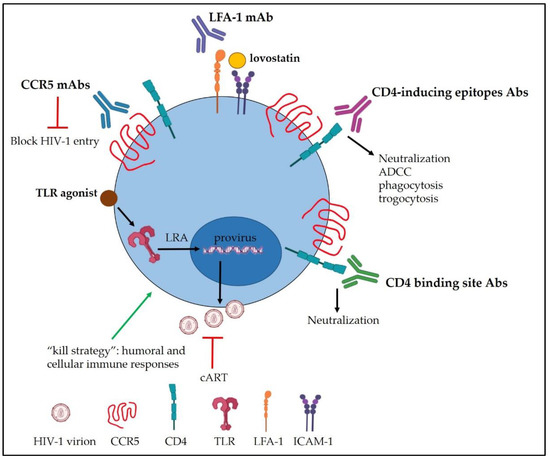At the end of December 2020, 27.5 million people were accessing antiretroviral therapy (ART), up from 7.8 million in 2010. This life-long treatment reduced new human immunodeficiency virus type 1 (HIV-1) infections by 52% since its peak in 1997 [1], as well as the progression to Acquired Immunodeficiency Syndrome (AIDS) and the complications associated with inflammation [2]. When combined, anti-retroviral drugs provide complete viral suppression for several years. Challenges to the global eradication of HIV-1 infection include the persistence of viral reservoirs of latently infected cells, mainly resting CD4+ T lymphocytes, in which the virus reactivates once the therapy is interrupted [3,4]. Moreover, HIV-1 infected patients experience non-AIDS diseases including cardiovascular and bone diseases and cognitive disorders [5]. To overcome these barriers, new strategies have been implemented to achieve a more effective curative intervention to eradicate HIV-1. Here, we will review the preclinical and clinical advances of cell-based immunotherapies. We will focus on coreceptor-targeting antibodies (Abs), particularly those targeting CCR5, and among the Env-specific antibodies, we will point out those targeting CD4-induced (CD4i) epitopes of the CD4-binding site (CD4bs). Together with approaches targeting the HIV-1 replication cycle, we will discuss the strategies aimed at boosting and modulating specific HIV-1 immune responses, highlighting the harnessing of Toll-like receptors (TLR) agonists for their dual role as latency reverting agents (LRAs) and immune-modulatory compounds. A schematic overview of the approaches discussed here is reported in Figure 1. Ninety clinical trials based on the targets reported in this review are registered on ClinicalTrial.gov (accessed on 24 November 2020).