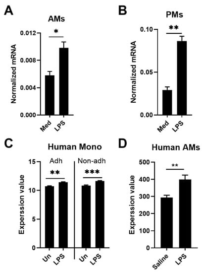 To obtain insight in changes in Tet2 mRNA levels during macrophage activation, we first stimulated mouse AMs and PMs with LPS in vitro and measured Tet2 expression (Figure 1A,B). Macrophages from both body sites showed increased Tet2 mRNA levels upon LPS exposure. To determine whether TET2 expression is regulated similarly in human cells, we made use of publicly available datasets derived from previous studies from our group [27,28]. Primary human monocytes, either adherent or non-adherent, stimulated with LPS demonstrated increased TET2 mRNA levels relative to monocytes cultured in medium only (Figure 1C; GSE161839) [27]. Likewise, human AMs harvested after an in vivo bronchial LPS challenge in healthy subjects showed increased TET2 mRNA levels when compared with AMs obtained from the contralateral control lung administered with normal saline (Figure 1D, GSE40885) [28]. Taken together, these data show that Tet2/TET2 is upregulated in mouse and human macrophages, as well as human monocytes, after exposure to LPS in vitro or in vivo.