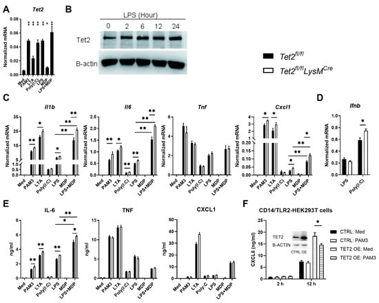 To determine whether Tet2 also can be induced by agonists of other common pattern recognition receptors (PRRs) besides LPS (which stimulates TLR4), murine BMDMs were incubated with PAM3CSK4 (TLR1/2), LTA (TLR2), Poly(I:C) (TLR3) or MDP (NOD2) (Figure 2A). All stimuli increased Tet2 expression, which is consistent with previous studies reporting that Tet2 can be induced by activation of NF-κB and MyD88 dependent signaling [14,15]. Akin to primary AMs and PMs, LPS induced Tet2 in BMDMs, which was further enhanced by the addition of MDP. Furthermore, an increase of Tet2 protein levels in BMDMs was detected from 2 h after LPS stimulation and maintained until 24 h (Figure 2B). To investigate the role of Tet2 in macrophage activation, we incubated BMDMs generated from bone marrow of myeloid cell-specific Tet2 knockout (Tet2fl/flLysMCre) mice and littermate control (Tet2fl/fl) mice with various PRR ligands and measured the expression of Il1b, Il6, Cxcl1 and Tnf. LTA and LPS induced higher expression of Il1b, Il6 and Cxcl1 in Tet2 knockout macrophages (Figure 2C). While MDP did not increase cytokine mRNA’s to a significant extent, the addition of MDP to LPS resulted in synergistic induction of Il1b, Il6 and Cxcl1, corroborating previous studies [37,38,39], which was further enhanced in Tet2 knockout macrophages (Figure 2C). TLR3 signals via a different (non-MyD88 dependent) route when compared with other TLRs, resulting in amongst other induction of type I interferons [40]. BMDM Tet2 deficiency was also associated with enhanced Il6 and Ifnb expression upon stimulation with the TLR3 agonist Poly(I:C) (Figure 2C,D). Expression of Tnf was not influenced by Tet2 deficiency irrespective of the stimulus, which is consistent with a previous study [16]. Tet2 deficient BMDMs released more IL-6 protein when compared with control BMDMs, whilst CXCL1 and TNF release was similar between genotypes (Figure 2E). BMDMs did not release IL-1β upon LPS stimulation. To further investigate the effect of Tet2 on TLR-induced cell activation we overexpressed human TET2 in CD14/TLR2-HEK293T cells. TET2 overexpression (confirmed by western blot as shown in the inset of Figure 2E) significantly reduced CXCL8 production induced by PAM3CSK4 (Figure 2F). Together, these data suggest that TET2 represses the transcription of certain cytokine/chemokine genes in response to TLR stimulation.