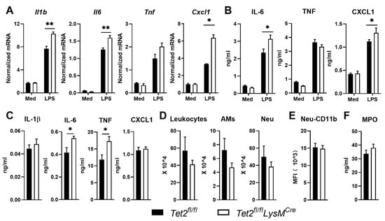 Impact of myeloid Tet2 deficiency on LPS-induced responses by alveolar macrophages in vitro and intact lungs in vivo. (A) Ilb, Il6, Tnf and Cxcl1 expression in alveolar macrophages (AMs) from Tet2fl/flLysMCre (open bars) and control mice (black bars) after stimulation with medium control or LPS for 12 h; mRNA expression was normalized to Hprt mRNA; (B) IL-6, TNF and CXCL1, production by AMs from Tet2fl/flLysMCre and control mice after stimulation with medium control or LPS for 12 h; (C) IL-1β, IL-6, TNF and CXCL1 protein levels, (D) number of total leukocytes, AMs and neutrophils (Neu), (E) neutrophil CD11b expression and (F) MPO levels in bronchoalveolar lavage fluid from Tet2fl/flLysMCre and control mice 6 h after administration of LPS (1 µg/mouse) via the airways. n = 6 for (A,B), n = 8 for (C–F). Data are shown as bar graphs with mean ± SEM. p-values were calculated using Mann–Whitney test. * p < 0.05, ** p < 0.01.