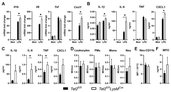 PMs represent the main resident leukocyte subpopulation in the peritoneal cavity at homeostasis [45]. To determine the role of Tet2 in PMs, PMs were harvested from Tet2fl/flLysMCre and Tet2fl/fl control mice and stimulated with LPS in vitro. Tet2-deficient PMs demonstrated enhanced Il1b, Il6 and Cxcl1 expression, and released more IL-1β, IL-6 and CXCL1, upon LPS stimulation, while TNF induction was not affected by Tet2 deficiency at either transcriptional or translational level (Figure 5A,B). To gain insight in the role of macrophage Tet2 in LPS-induced peritoneal inflammation in vivo, Tet2fl/flLysMCre and control mice were injected with LPS intraperitoneally; 6 h thereafter cytokine levels and leukocyte numbers were determined in PLF. Tet2fl/flLysMCre mice had higher IL-6 and TNF concentrations in PLF when compared with control mice, whilst IL-1β (p = 0.16) and CXCL1 (p = 0.08) levels tended to be higher (Figure 5C). Leukocyte cell numbers and neutrophil activation (measured as CD11b expression and MPO levels) in PLF were not different between mouse strains (Figure 5D–F). Collectively, these data suggest that Tet2 represses cytokine gene expression in PMs exposed to LPS as well as peritoneal cytokine release during LPS-induced peritonitis without affecting cell influx into the peritoneal cavity.