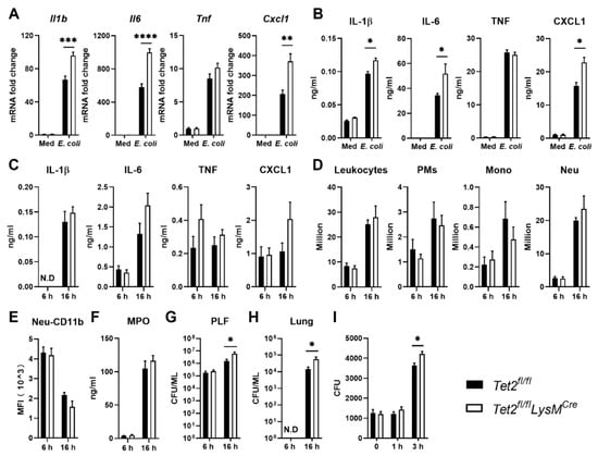 LPS is a common virulence factor of gram-negative bacteria, among which E. coli is one of the major pathogens involved in peritonitis [35], and peritonitis is the second most common cause of sepsis [46,47,48]. Akin to results obtained after LPS stimulation (Figure 5A,B), Tet2-deficient PMs exposed to E. coli showed increased Il1b, Il6 and Cxcl1 expression, and IL-1β, IL-6 and CXCL1 protein release, when compared with control PMs, while induction of TNF was not affected (Figure 6A,B). To obtain insight into the role of macrophage Tet2 in bacterial peritonitis in vivo, Tet2fl/flLysMCre and control mice were infected with viable E. coli through intraperitoneal injection and euthanized at 6 or 16 h thereafter to study inflammatory responses and bacterial loads. Cytokine levels (Figure 6C), leukocyte counts and neutrophil activation (Figure 6D–F) in PLF were not different between mouse strains at either time point. While at 6 h post-infection, bacterial burdens were not different between mouse strains in any body site, Tet2fl/flLysMCre mice had higher bacterial loads in PLF and lungs at 16 h post-infection when compared with control mice (Figure 6G,H). The E. coli strain used in this study is resistant to phagocytosis and killing by phagocytes [49]; thus, we next evaluated the bacterial growth-inhibiting capacity of PMs from Tet2fl/flLysMCre and Tet2fl/fl control mice in cocultures with viable E. coli in vitro (Figure 6I). E. coli numbers increased in the presence of PMs from both mouse strains beyond 1 h of incubation, but to a larger extent in cultures with Tet2 deficient PMs, suggesting that Tet2 contributes to macrophage-mediated bacterial growth inhibition. To explore possible underlying mechanisms, we tested the expression of genes related to antimicrobial effector functions in Tet2 deficient and control PMs after E. coli stimulation, i.e., Rnase6 (encoding ribonuclease A family member K6), Lcn2 (lipocalin-2), Hamp (hepcidin antimicrobial peptide), Camp (cathelicidin antimicrobial peptide) and Cat (catalase). The expression of none of those genes was changed by Tet2 deficiency, although they were induced by E. coli (Figure S6A). In addition, we also evaluated the expression of genes related to ROS or NOS production, i.e., Nos2 (nitric oxide synthase 2), Nox2 (NADPH oxidase 2), Sod1 (superoxide dismutase), Gpx4 (glutathione peroxidase 4) and Ptx3 (pentraxin 3). Of these, the expression of Nos2, Sod1 and Ptx3 was increased by E. coli, but not significantly altered by Tet2 deficiency, although the expression of Nos2 and Sod1 tended to be lower in Tet2 deficient peritoneal macrophages (Figure S6B). This model of E. coli peritonitis is associated with (late) distant organ injury and sepsis [35]. To evaluate a possible role of myeloid cell Tet2 herein we measured the plasma of AST, ALT (both reflecting hepatocellular injury) and LDH (reflecting cell injury in general) (Supplementary Figure S7A–C), and evaluated lung injury by assessing lung histopathology (Supplementary Figure S7D,E) 16 h after infection. None of these parameters differed between Tet2fl/flLysMCre and control mice. Collectively, these data suggest that Tet2 is involved in antibacterial defense mediated by PMs during E. coli induced peritonitis.