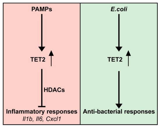 The role of TET2 in myeloid cells during PAMPs stimulation and E. coli infection. PAMPs stimulation induces TET2 expression, resulting in downregulation of inflammatory mediators (such as Il1b, Il6 and Cxcl1) in a HDACs dependent manner; TET2 is induced during E. coli infection and contributes to myeloid cell-mediated host anti-bacterial defense. PAMPs: Pathogen-associated molecular pattern molecules; TET2: Tet methylcytosine dioxygenase 2; HDACs: Histone deacetylases.