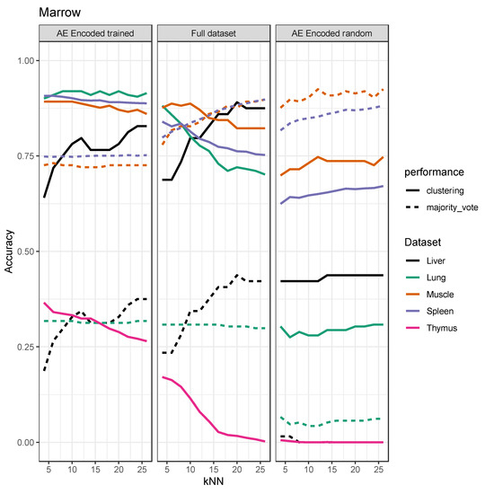 Example kNN-model predicting accuracy of common cell type labels. The kNN was trained on Marrow dataset from Smart-seq2, on the datasets encoded by a trained autoencoder, full dataset, and a randomly initialized autoencoder. Predicting cell type labels for the other Smart-seq2 datasets. Dashed line indicates performance when taking a majority vote as prediction, which assigns all cells to the most abundant cell type. The left represents the kNN model trained and tested on the encoded datasets, the middle represents the kNN model trained and tested on the full dataset and the right represents the kNN trained and tested on data encoded by a randomly initialized autoencoder.