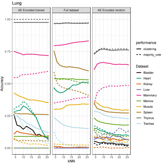 kNN was trained on combined Lung dataset from Smart-seq2 and 10x genomics, on data encoded by the trained autoencoder, full dataset, and dataset encoded by a randomly initialized autoencoder. Predicting cell type labels for the other combined datasets. Dashed line indicates performance when taking a majority vote as prediction, which assigns all cells to the most abundant cell type. The left represents the kNN model trained and tested on the encoded datasets, the middle represents the kNN model trained and tested on the full dataset, and the right represents the kNN trained and tested on data encoded by a randomly initialized autoencoder.