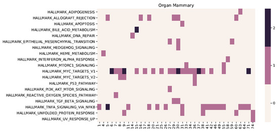 From the heatmap Figure 5, we can see that hidden units generally do not appear to share tasks when normalized to the total dataset, suggesting intact explainability of the model, as investigated in a previous study [14]. Most of the hidden units have one or few significant pathways associated with their activity, as calculated by the saliency maps. For 19 of the hidden units, only one pathway is significant (11 units have two significant pathways, 6 have 3, and 2 have 4 and 5 pathways, respectively). For the pathways, 11 out of 50 are significant in only one hidden unit, and four have more than four. Out of 50 hallmark signatures that become significant when calculating saliencies for all cells in the Mammary dataset, there are 19 of which two (adipogenesis, epithelial-mesenchymal transition) are also the most significantly overlapping (p < 2.27 × 10−3, hypergeometric test) with breast tissue-specific genes from Protein Atlas [36]. Signature Hallmark pathways “Myogenesis” and “UV-response UP” that are significantly overlapping with tissue specifically expressed genes from both skeletal muscle and breast tissue are not found significant. These results suggest that the primary signal when interpreting saliencies from the direct transfer of foreign models provides mainly differences between the dataset used for training and the data subsequently passed. Further studies are needed to explore if this feature can be scaled to larger or combined datasets, e.g., to delineate differences in normal cells from cancer cells. In order to further investigate the tendency to share tasks over hidden units, the significant pathways were calculated on a model trained without orthogonality constraint where the remaining parameters are tuned with Bayesian Optimisation (see Supplementary File S1: Section H). Here, only 13 of the hidden are significantly associated with a single pathway (10 units have 2 significant pathways, 6 have 3, and 1 has 5), suggesting that the orthogonality constraint is a contributing factor to ensure interpretability.