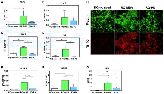 Analysis of inflammatory molecules in differentiated SH-SY5Y cells stimulated with RQ-MSA, RQ-PD and RQ-no seed. RT-qPCR analysis of TLR2 (A), TLR6 (B), TRAF6 (C), IL6 (D), NLRP3 (E), SOD2 (F) transcripts in SH-SY5Y exposed to RQ-MSA, RQ-PD (2.5 μM), and RQ-no seed for 24 h (mean ± SD). (G) NO release (mean ± SD) quantification through Griess’ reaction in the supernatants of cells stimulated with RQ-MSA, RQ-PD and RQ-no seed. Statistical significance was assessed by one-way ANOVA test with Dunnett’s multiple comparison test. Corrected p-values are reported in the results section. * p ≤ 0.05, ** p ≤ 0.01, *** p ≤ 0.001. (H) Confocal microscopy analysis showed increased TLR2 expression (red) in SH-SY5Y exposed to RQ-MSA and RQ-PD. Counterstaining with Alexa-Fluor 488-Phalloidin (green) was performed to monitor the cytoskeleton structure that appeared preserved in all experimental conditions. Scale bar = 25 µm.