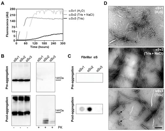 To better investigate whether the αSynD strains responsible for MSA and PD might have influenced the distinctive biochemical properties of RQ-MSA and RQ-PD, we decided to generate three different artificial αSyn amyloid fibrils, named αSv1, αSv2 and αSv3. These aggregates were produced starting from rec-αSyn that was incubated in three different buffers without ThT (Table 1). To monitor the formation of αSyn fibrils in each experimental condition, a group of samples was supplemented with ThT (Figure 4A). At the end of the aggregation (monitored by ThT), samples were extensively characterized from a biochemical and morphological point of view. In particular, αSv1 fibrils mostly aggregated side-by-side, were sensitive to PK treatment and barely recognized by the MJFR antibody (Figure 4B–D). In contrast, αSv2 fibrils were generally longer than those of αSv1 and did not aggregate side-by-side but formed a net-like structure. In addition, over-twists were detectable at regular intervals in most of the fibrils. These aggregates were partially resistant to proteolytic digestion and four PK-resistant bands (migrating between 3 and 14 kDa) were detected by Wb. The MJFR antibody well-interacted with the sample (Figure 4B–D). Finally, αSv3 fibrils aggregated either side-by-side or by forming a net-like structure and many of them showed the presence of over-twists. We have also observed the presence of some amorphous material that was not found in the other samples (see arrows in Figure 4D). αSv3 was less resistant to enzymatic digestion than αSv2 and two PK-resistant bands were observed at Wb, always migrating between 3 and 14 kDa. In this case, the MJFR antibody did not interact with the fibrils (Figure 4B–D). The differences in PK resistance properties, biochemical profiles, affinity toward the MJFR antibody, and TEM findings of αSv1, αSv2 and αSv3 demonstrated that we efficiently generated distinct artificial aggregates of αSyn (Figure 4B–D, Table 1). Finally, αSv1, αSv2 and αSv3 were incubated with eight fluorescent probes which differently interacted with the aggregates, hence confirming that they acquired distinct morphological properties (Supplementary Figure S1).