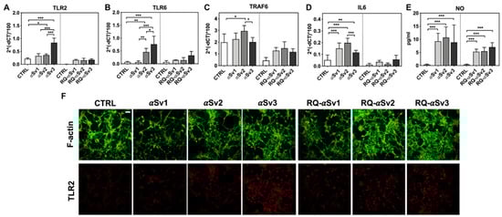 Analysis of inflammatory molecules in differentiated SH-SY5Y cells stimulated with αSv1, αSv2, αSv3 and their αSyn_RT-QuIC reaction products (RQ-αSv1, RQ-αSv2, and RQ-αSv3). RT-qPCR analysis of TLR2 (A), TLR6 (B), TRAF6 (C), IL6 (D) showed an upregulation of the inflammatory mediators transcript levels in cells stimulated with αSv1, αSv2, αSv3 but not in those stimulated with RQ-αSv1, RQ-αSv2, and RQ-αSv3. (E) NO quantification in the supernatants of cells stimulated with αSv1, αSv2, αSv3, RQ-αSv1, RQ-αSv2, and RQ-αSv3 and related control buffers. A significant increase in NO release was found only in αSv1, αSv2, αSv3, RQ-αSv1, RQ-αSv2, and RQ-αSv3 stimulated cells. Values are expressed as mean ± SD. Statistical significance was assessed by one-way ANOVA test with Dunnett’s multiple comparison test. Corrected p-values are reported in the results section. * p ≤ 0.05, ** p ≤ 0.01, *** p ≤ 0.001. (F) Immunofluorescence analysis of TLR2 expression (red) in SH-SY5Y treated cells or in control condition showing an increase in protein expression in all SH-SY5Y stimulated cells that was more intense in those challenged with αSv3. Counterstaining with Alexa-Fluor 488-Phalloidin (green) was performed to monitor the cytoskeleton structure. Bar scale = 25 µm.