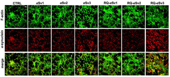 Intracellular αSyn aggregates in SH-SY5Y cells stimulated with αSv1, αSv2, αSv3 and their αSyn_RT-QuIC reaction products (RQ-αSv1, RQ-αSv2, and RQ-αSv3). SH-SY5Y cells, stimulated with αSv1, αSv2, αSv3, RQ-αSv1, RQ-αSv2, RQ-αSv3 (2.5 μM for 24 h) and control (CTRL), were stained for αSyn (red) to visualize the cellular aggregates. With respect to CTRL, all stimulated SH-SY5Y cells showed clusters of αSyn aggregates that were more abundant in those challenged with both αSv3 and RQ-αSv3. Cells were counterstained with Alexa-Fluor 488-Phalloidin (green) to highlight the thin neurite-like cytoplasmic structures (cell-to-cell contacts) denoted by F-actin filaments. The cytoskeleton of the cells was preserved, regardless of the presence of αSyn aggregates. Scale bar = 25 µm.
