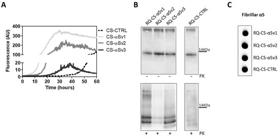 The lack of biochemical differences among RQ-αSv1, RQ-αSv2, RQ-αSv3 could be due to the artificial nature of αSv1, αSv2, and αSv3, as previously mentioned. For this reason, the αSyn aggregates formed in SH-SY5Y cells stimulated with αSv1, αSv2, αSv3 (CS-αSv1, CS-αSv2, and CS-αSv3, respectively) were subjected to αSyn_RT-QuIC analysis considering that their composition might be more similar to that of the natural αSynD strains (e.g., presence of phosphorylation). Indeed, it has already been shown that the stimulation of SH-SY5Y cells with PFFs induced intracellular accumulation of phosphorylated αSyn, which is similar to that aggregating in the brains of patients with α-synucleinopathies []. All samples induced an efficient seeding activity with respect to the control (CS-CTRL). Notably, the kinetics of rec-αSyn aggregation stimulated by αSv3 (Figure 4A) and CS-αSv3 (Figure 8A) were found to be less efficient compared to the other samples. The final αSyn_RT-QuIC products generated by CS-αSv1, CS-αSv2, CS-αSv3 and CS-CTRL (named RQ-CS-αSv1, RQ-CS-αSv2, RQ-CS-αSv3 and RQ-CS-CTRL, respectively) were subjected to Wb analysis after PK digestion and showed the presence of three PK resistant bands, thus confirming the lack of biochemical differences among specimens (Figure 8B). Dot blot analysis revealed that the MJFR antibody was able to bind all the aggregates with similar affinity, sustaining that they all possessed similar morphological properties (Figure 8C).
