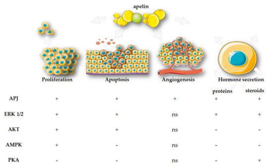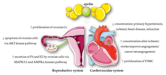 The most commonly used variant of apelin in laboratory tests is apelin-36, which has been found in the lungs, uterus, and testes [8]. The most active protein isoform is apelin-13, located in the mammary gland and hypothalamus [8]. Many studies have confirmed the important role of apelin in the human body, especially in the cardiovascular and reproductive systems (Figure 2). The regulatory effect of apelin has also been observed on the evolution and activity of the cardiovascular system; the apelin concentration was lower in patients with primary hypertension, ischaemic heart disease, or those who underwent infarction, compared with healthy individuals [9,10,11]. Other studies have shown that the increase in the level of apelin had a dual nature: it had a positive effect on the course of angiogenesis after ischaemic stroke [12], but it could also stimulate the process of cancer neoangiogenesis [13]. Recent research has shown that apelin could also promote proliferation of vascular smooth muscle cells (VSMC) [14] or rat ovarian granulosa cells (Gc) [15]. In addition, a number of studies indicated a significant role of apelin in the female reproductive system [16]. Its expression has been demonstrated, inter alia, in the ovaries of pigs, bovines, rhesus monkeys, and humans [16]. Studies conducted so far have indicated, for example, that apelin may regulate steroidogenesis in ovarian cells. Apelin significantly increased the secretion of progesterone (P4) and oestradiol (E2), and also increased the protein level of 3β—hydroxysteroid dehydrogenase/Δ5—4 isomerase (3βHSD) in human and porcine ovarian cells by activating the mitogen-activated protein kinase 3 (MAPK3) and 5’AMP-activated protein kinase (AMPK) pathways [17,18]. In turn, apelin is one of the factors that slows down apoptosis and increases proliferation in the ovaries by activating the protein kinase B (AKT) pathway [15].