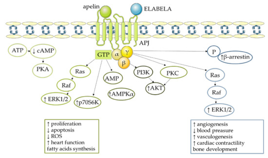Activation of different signaling pathways and affinity of apelin/ELABELA to APJ receptor. AKT—protein kinase B; AMPKα—5’AMP—activated protein kinase; ERK1/2—extracellular signal activated kinase 1/2; P70s6k—ribosomal protein S6 kinase beta—1; PKC—protein kinase C; ATP—adenosine triphosphate; AMP—adenosine monophosphate; Camp—cyclic adenosine monophosphate; PI3K—phosphoinositide 3-kinase; ↑—increase; ↓—decrease.