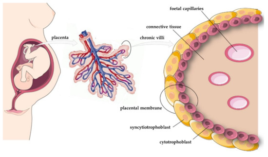 The placenta is a crucial organ that provides a link between foetus and mother during pregnancy. The process of placentation begins after fertilisation, when the blastocyst adheres to the endometrium (inner layer of the uterus), which at this time is called the decidua, and the outer layer of cells (the trophoblast) starts to invade them (6–7 days postfertilisation (dpf) [60]. The trophoblast comprises two cell types that create inner and external layers called, sequentially, the cytotrophoblast and the syncytiotrophoblast [61,62] (Figure 4). The fusion between the cytotrophoblast and the syncytiotrophoblast is controlled by multiple factors such as cytokines, protein kinases, proteases, and transcription factors. At around 8–9 dpf, these placental layers form fluid-filled spaces, and at about 14 dpf, fluid-filled villus structures appear in the syncytiotrophoblast [63,64]. Before fusion, the cytotrophoblast appears similar to the syncytiotrophoblast, but the former comprises uninuclear cells derived from the trophectoderm, while the latter is multinucleated [62,65]. The syncytiotrophoblast has a mitotic index of 0, while the same parameter in the cytotrophoblast is about 1.5–2.9% [66,67]. The latest literature data suggest that the cytotrophoblast takes part in the metabolism of maternal-derived fatty acids and the biosynthesis of human placental lactogen (hPL) and human chorionic gonadotropin (hCG) [68,69]. During weeks 10–41 of pregnancy, the number of cells in the cytotrophoblast increases, but their volume is reduced. Moreover, in the late first trimester, the cytotrophoblast contains closely packed cells, but the structure is relatively thin [70,71]. Other studies suggested that during the first half of pregnancy, the syncytiotrophoblast was easy to identify due to a continuous row of nuclei, while in the second half of pregnancy, this structure became thinner and nuclei were located in groups, forming syncytial nuclear aggregates for better contact with placental blood vessels [72]. During pregnancy, the syncytiotrophoblast has the highest metabolic and endocrine activity in the placenta, and it participates in mother–foetus transfer of amino acids; water; gases; and hormones such as hCG, hPL, placental growth factor (PLGF), and leptin [60,73]. Moreover, the outer layer of the syncytiotrophoblast contains receptors for epidermal growth factor (EGF), insulin-like growth factor (IGF), and platelet-derived growth factor (PDGF) [74,75,76]. At 28 weeks of gestation, the syncytiotrophoblast surface is about 5 m2, while at full-term pregnancy, it reaches around 11–12 m2 [77]. During implantation, the developing syncytium invades the endometrium and forms fluid-filled spaces called lacunes (lacunar phase) [78]. About 3 weeks after fertilisation, the syncytiotrophoblast proliferates and is penetrated by the cytotrophoblast, after which the primary villi are created. Subsequently, secondary villi are formed by the growth of extraembryonic mesenchymal cells into the primary villi, and at 18 dpf, foetal capillaries penetrate these structures, creating tertiary villi [79]. After 3 months, the placenta is a fully developed organ that increases in size as a result of villus hypertrophy and elongation, reaching maturity at around 36–37 weeks of pregnancy [80].