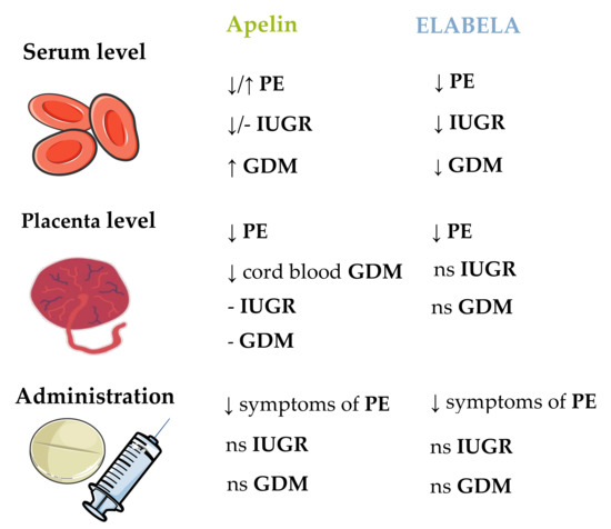 Changes in serum and placental apelin levels, as well as its administration effect during pregnancy pathologies. PE—preeclampsia; IUGR—intra uterine growth restriction; GDM—gestational diabetes mellitus; ↑—increase; ↓—decrease; ns—no study.