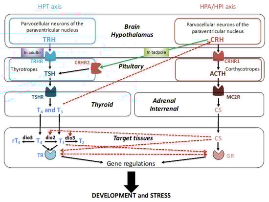 In some amphibians, the main action controlled by the HPT and HPI axes is the developmental body change corresponding to metamorphosis (from the Greek meta- (change) and morph (form)) [2]. This post-embryonic developmental process is strongly linked to a need to adapt to a change in habitat for complex life cycles with different ecophases. This period is also a developmental window sensitive to diverse biotic and abiotic factors that can induce an organismal response by modulating hormone production by the HPT and HPI neuroendocrine axes that then profoundly influence behavior, morphology, growth, and development [3]. Stressors, such as pond desiccation, predation, or limited food availability, can cause activation of the HPI axis [4]. In normal and stressed conditions, the synthesis and release of TSH is under the control of CRH in tadpoles [3,5] (Figure 1, Green arrow). The classical regulation of TSH by TRH seen in other vertebrates occurs only after metamorphosis [6] (Figure 1, purple arrow). CRH injection into tadpoles is able to accelerate metamorphosis by increasing TSH and ACTH levels [7,8]. Other interactions between the HPT and HPI axes can be involved in the control of the timing and the rate of metamorphosis (Figure 1, red arrows). CSs can repress the expression of inactivating deiodinases and promote the expression of activating deiodinases, thus contributing to T3 availability in target cells [9]. Further, TH can act in synergy with CSs at the level of their respective receptors. CSs increase the amount of TR transcripts [10] and the binding capacity of T3 in nucleus [11]. Conversely, T3 can increase the expression of GR in the tail and decrease its expression in the brain [12]. Finally, some genes are synergistically regulated by T3 and CSs during metamorphosis [13,14,15] and some through direct transcriptional regulation by TR and GR [16]. In the present review, we will highlight the hormonal control of metamorphic changes by THs, with increasing evidence pointing to prominent roles by CSs. We will also highlight the conservation during vertebrate evolution of both hormones signaling and their interaction.